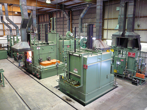 Eckel Heat Treating operates six large batch ovens 24 hours a day that have a maximum temperature of 1800° degrees and 8,000 pound capacity. Our ovens have internal quench protected atmosphere for part uniformity and advanced dual tube generators which provide 98% uptime with automated dew point control. The two oven lines are dual draw furnaces with Honeywell controllers which are calibrated on a quarterly basis. Line #1 has a maximum capacity of (30 x 48 x 30 in. / 2,000 lb. / 2,500 gal. quench tank) and Line #2 has a maximum capacity of (42 x 72 x 42 in. / 8,000 lb. / 8,000 gal. quench tank) which incorporates a spray dunk washer.